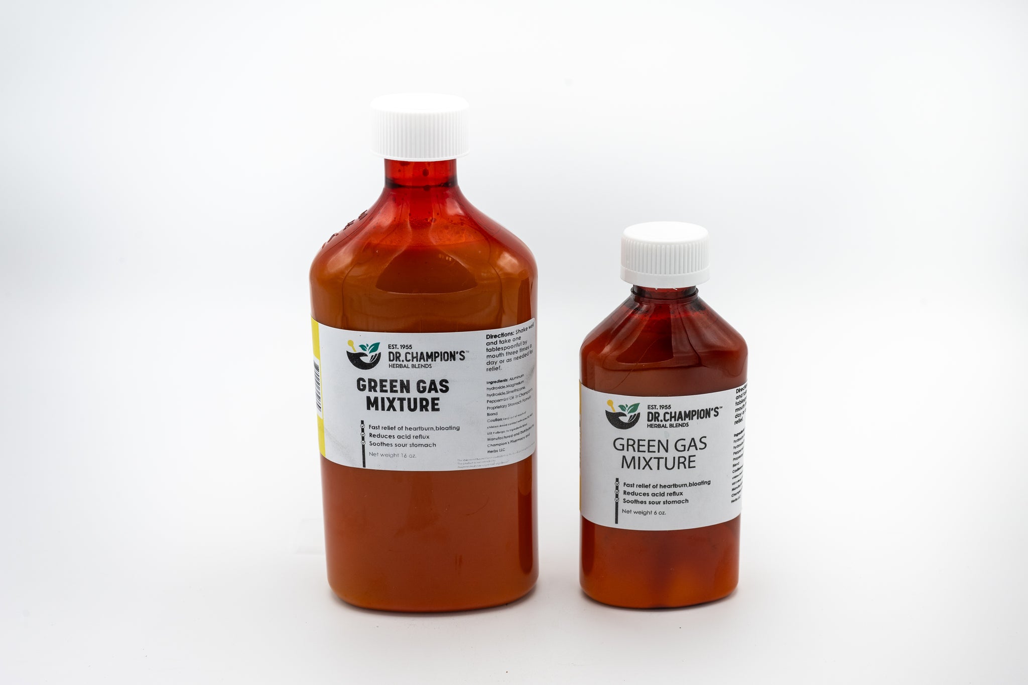 Acid reflux and gas are common gastrointestinal issues that can cause discomforts. Acid reflux occurs when stomach acid flows back into esophagus, causing irritation and often burning sensation in the chest. Gas can be a mixture of air swallowed while eating and drinking and gases produced by the breakdown of food by gut bacteria. Gas can lead to symptoms such as bloating, belching ,flatulence, abdominal discomfort and pain. This condition is common and treatable. Try our Dr. Champion's Green Gas Mixture to calm and soothe gastritis, acid reflux, sour stomach and abdominal bloating. Accelerate the gas to go.... with Dr. Champion's Green Gas Mixture!