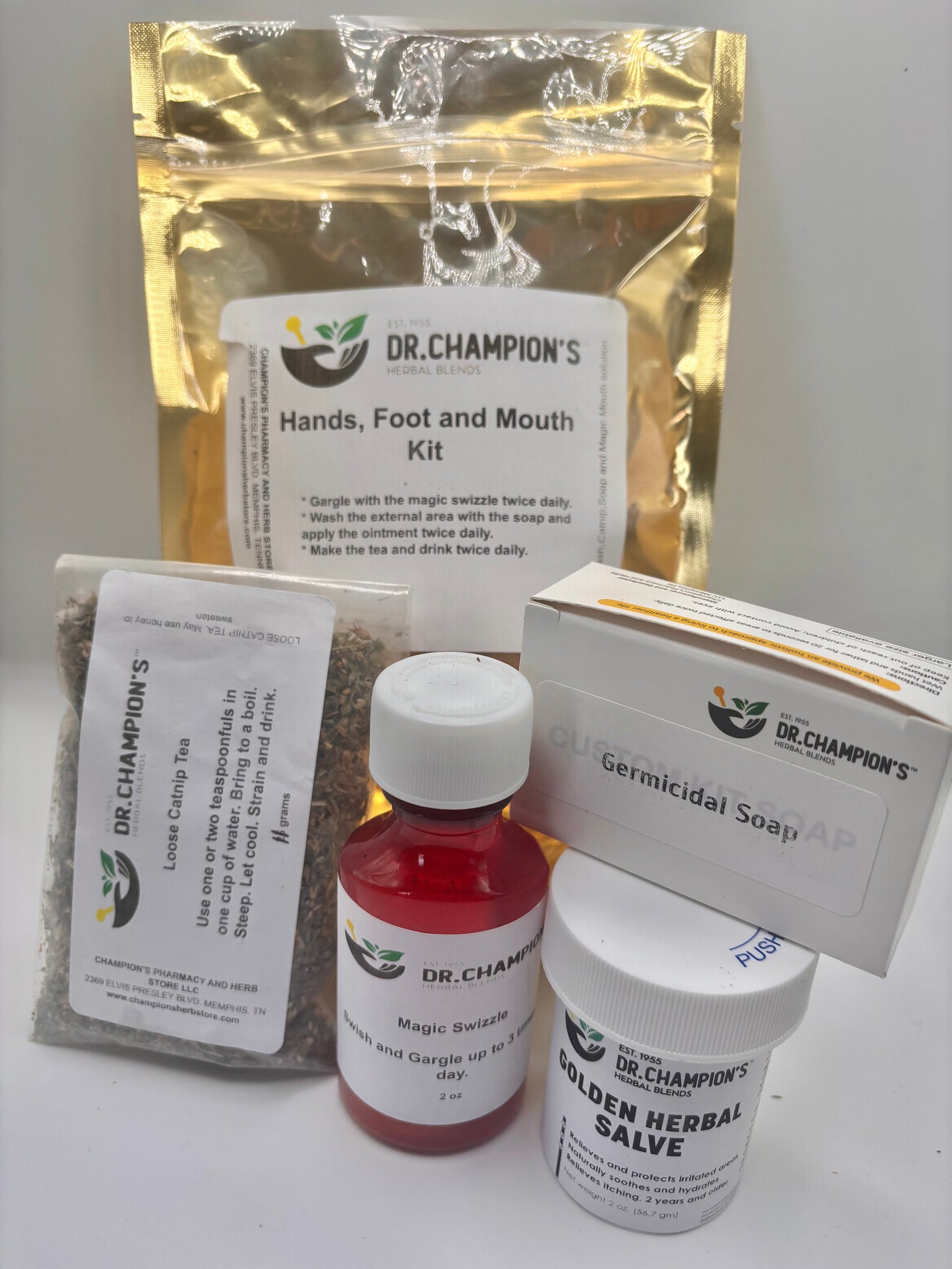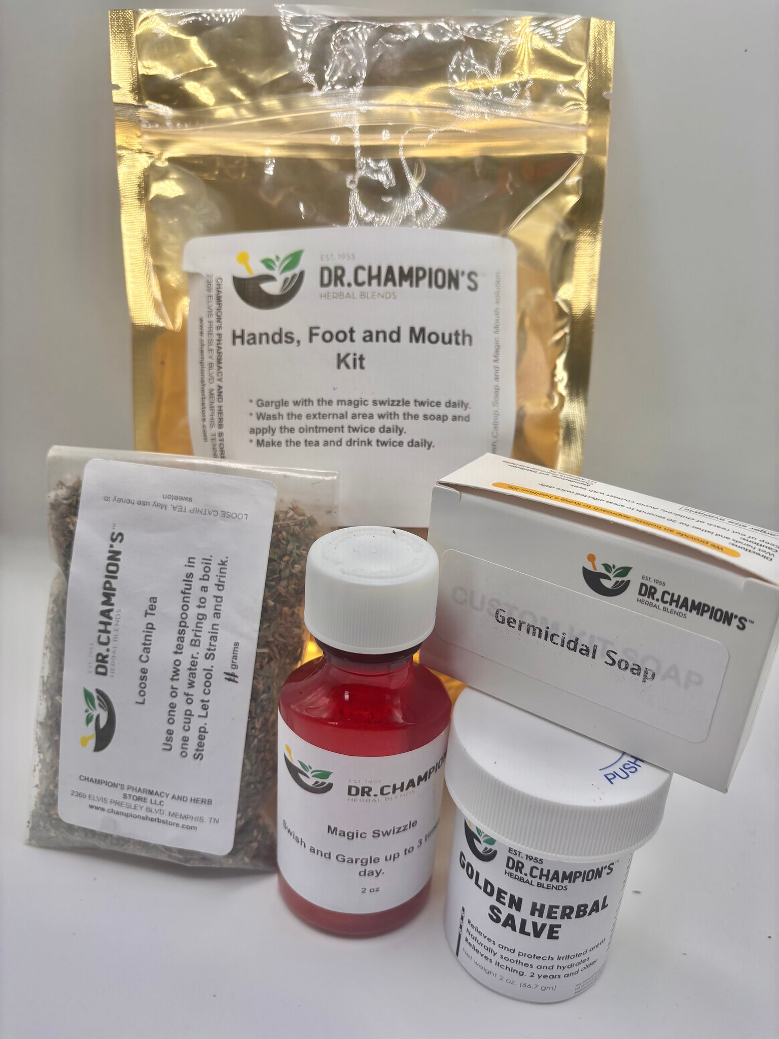 - Dr. Champion's Hands, Foot and Mouth Kit has you covered from mouth to foot. The kit includes: 2 oz Magic Swizzle,2 oz .Germicidal Soap,2 oz. Golden Salve and 2 oz Catnip tea. All products available in larger size.