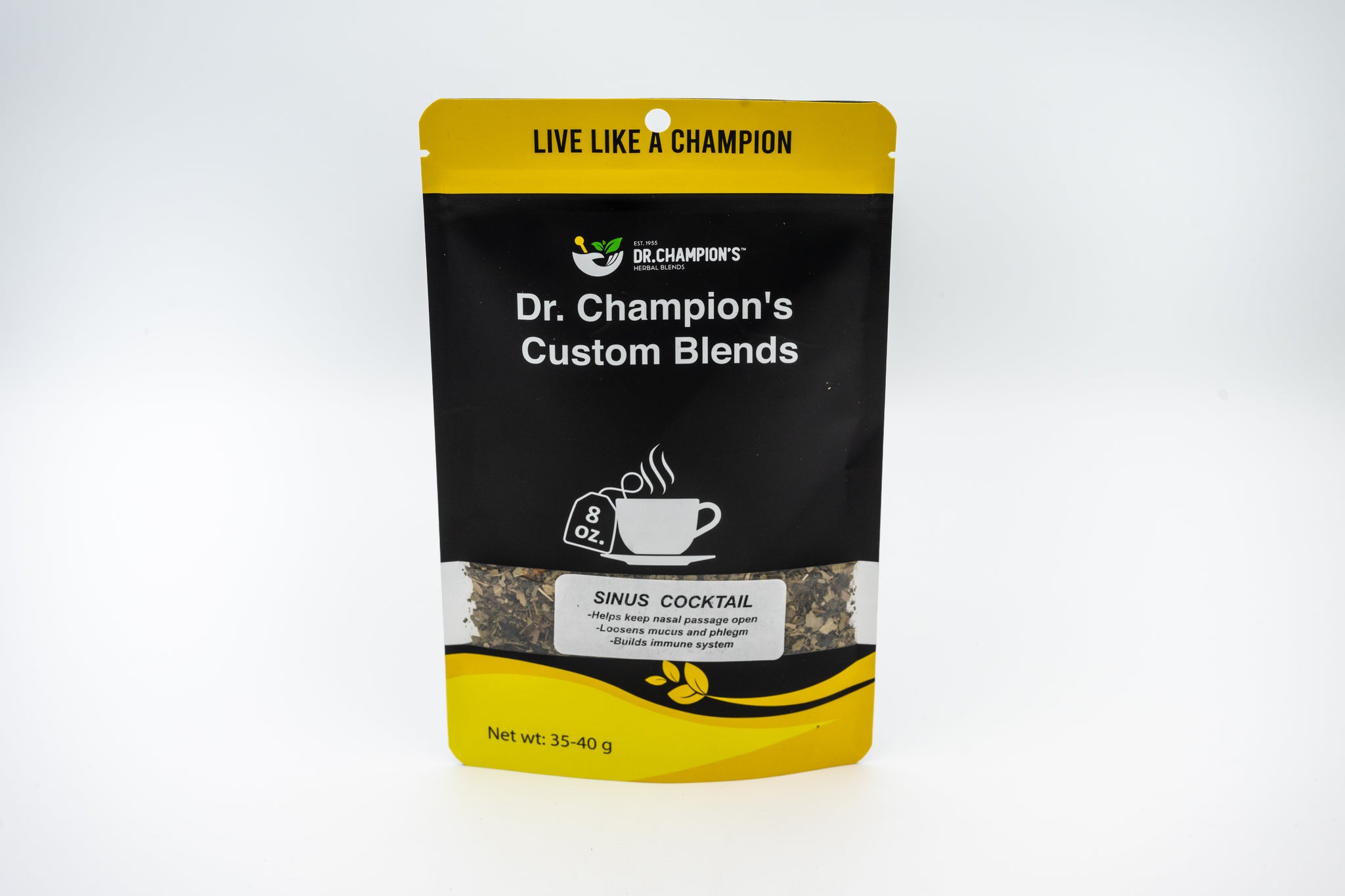 Our exclusive Dr. Champion's Sinus Cocktail Tea is a blend of several herbs that soothes and alleviates sinus pressure and loosens mucus from clogged nasal passages. Get your Sinus Cocktail tea today!